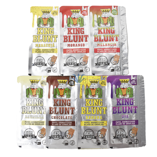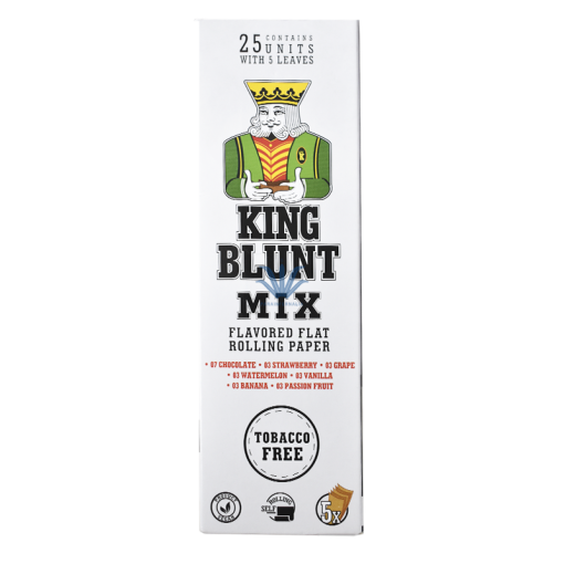 PAPEL KING BLUNT MIX En esta publicación les presentamos unos papeles blunt con calidad premium de la marca King Blunt. Estos mismos no superan los 15cm de largo, pudiendo ingresar una cantidad mayor de contenido y armar cigarros mas grandes que los comunes. Los sobrecitos de este producto traen 5 hojas de blunt, estos vienen saborizados y aromatizados a Banana, Sandia, Frutilla, Chocolate, Uva, Vainilla y Maracuyá ya que es un mix de sabores. No influye en el cambio del olor y/ o gusto del contenido ingresado, dándole una combinación de sabores perfecta. Los papeles de King Blunt son completamente libres de Tabaco y además, son productos veganos.