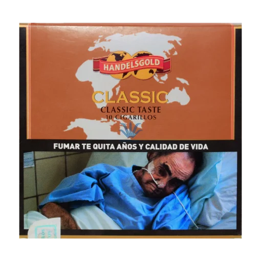 CIGARRO HANDELSGOLD CLASSIC x10u. Comprá tus cigarros Handelsgold Classic x10u al mejor precio en nuestra tienda online. Somos Parainfernalia un smokeshop ubicado en Buenos Aires que hace envíos a todo el país! Compra hasta en 3 cuotas! Si no los probaste, no te quedes sin probar la excelencia de los cigarros Handelsgold. Esta es su versión Classic en cajita de 10 cigarros (de 10cm de largo y 1cm de ancho), pero también tenes sus versiones en sabor Vainilla o Cherry que las podes encontrar disponibles en nuestra web! Son cigarros finos de una intensidad suave. Los cigarros Handelsgold son de origen alemán no te quedes sin disfrutar de un buen cigarro de primera calidad!