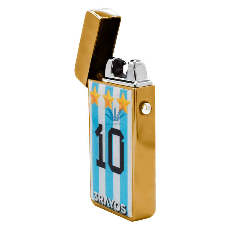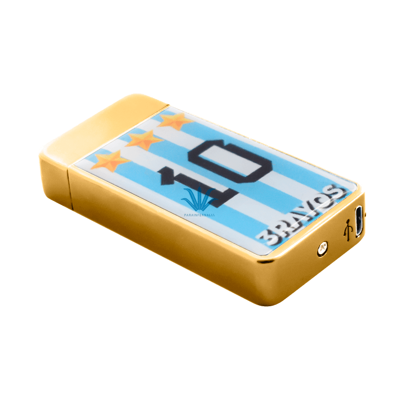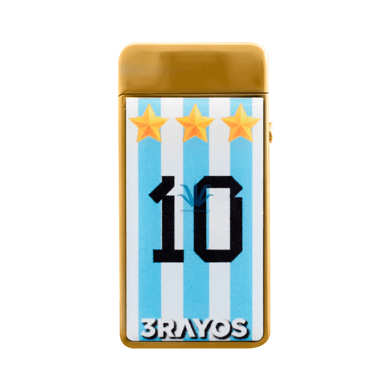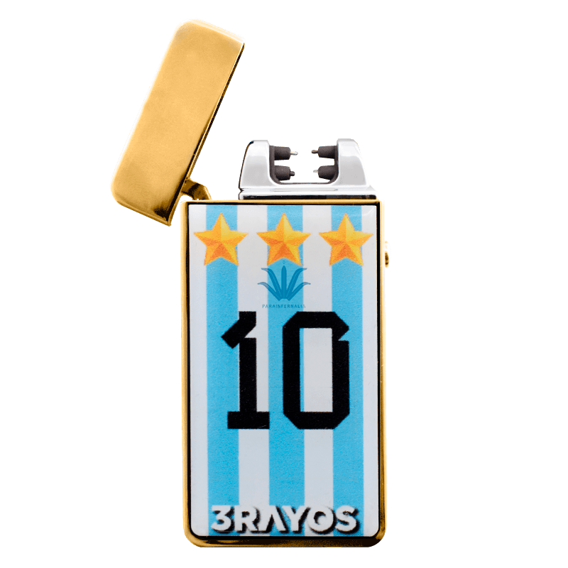 Encendedor Eléctrico 3Rayos Fun Argentina Dorado. Sofisticado encendedor eléctrico premium que combina tecnología avanzada con el orgullo argentino. Incorpora un sistema de doble arco de plasma con tecnología de diodos que garantiza un encendido confiable y resistente al viento en cualquier condición climática. Su diseño exclusivo rinde homenaje a la Selección Argentina de Fútbol, emulando la icónica camiseta nacional con las tres estrellas distintivas y el emblemático número 10, todo enmarcado en un elegante acabado metálico dorado que aporta distinción y sofisticación. La practicidad se encuentra en su sistema recargable mediante cable USB incluido, compatible con cualquier puerto de computadora o adaptador, eliminando la necesidad de combustibles tradicionales. Ideal para coleccionistas, aficionados al fútbol argentino o cualquier persona que aprecie la combinación perfecta entre funcionalidad moderna, durabilidad excepcional y acompañado por un diseño único de la selección.