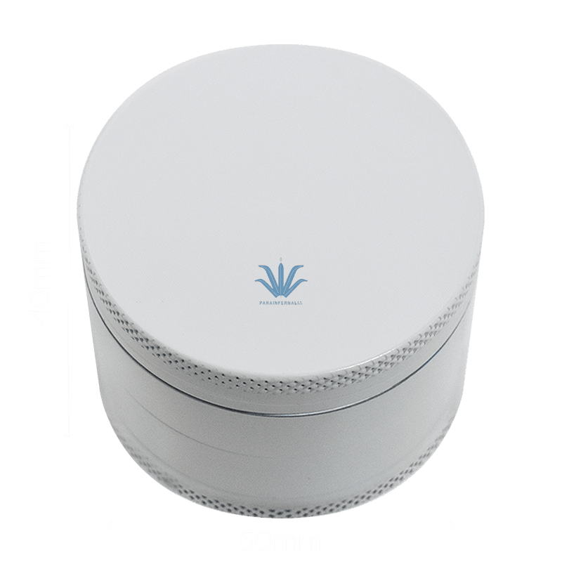 PICADOR STAMPS BLANCO 4 PARTES. Hoy les traemos un picador con un diseño completamente de color blanco en todo su cuerpo. Este producto esta hecho de metal, dividido en 4 partes que contienen lo siguiente. Las dos primeras partes cierran a través de un imán en la parte central y están compuestas de dientes en forma de rombo para una trituración perfecta y sin esfuerzos. En la tercera parte se puede ver una rejilla metálica que funciona como filtro del contenido triturado y por ultimo tenemos un contenedor con una palita recogedora de plástico. El diámetro de este picador es de 50mm y tiene una altura de 40mm.