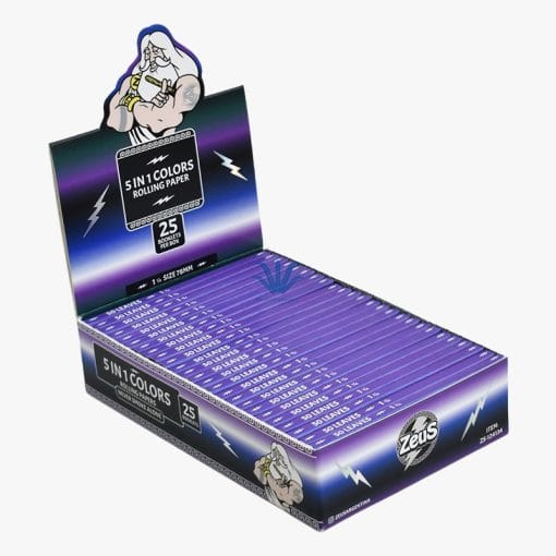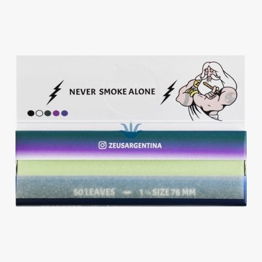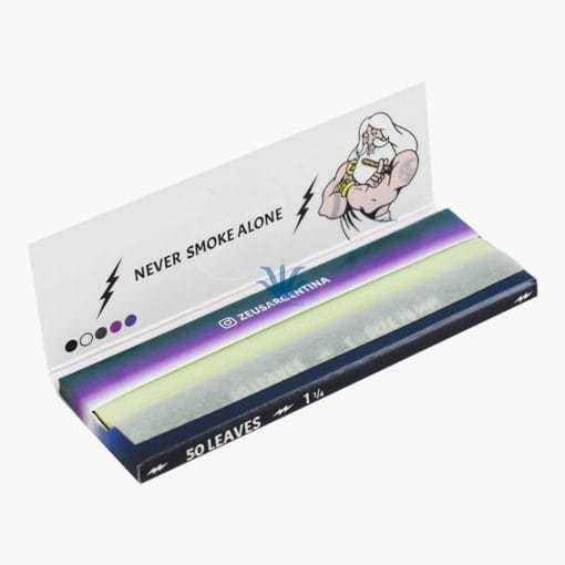 PAPEL ZEUS 5 EN 1 COLORES 1 1/4. ¿Te cansaste de los papeles de siempre? Con el Papel Zeus 5 en 1 Colores 1 1/4 vas a poder armar tus cigarros con estilo. Este pack trae 50 hojas súper finas en 5 colores distintos: verde, lila, celeste, negro y blanco, para que elijas el que vaya con tu mood. Es 100% natural, sin químicos raros, solo papel puro con combustión lenta para que disfrutes sin apuros. Cada hoja de 78 x 44 mm viene con su tirilla de goma arábiga para que pegue perfecto. Ideal para fumadores que buscan calidad sin aditivos. En Distribuidora POP somos distribuidores oficiales de Zeus en Argentina – conseguí todos los productos al mejor precio, pagá como más te convenga y recibilo en cualquier parte del país. ¡Dale color a tu experiencia!