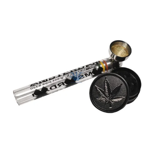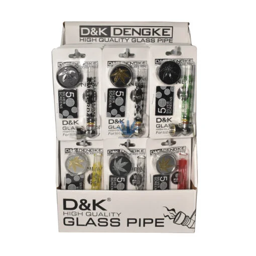Pipa D&K Motivos con Picador Este kit contiene pipa transparentes con diseños variados. Las pipas de vidrio D&K pequeñas son totalmente de vidrio pyrex, resistente a altas temperaturas. Su formato es recto con el quemador desmontable, viene con 5 repuestos para cambiar la rejilla del quemador y un mini grinder de metal.